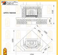 Предтопочная и надтопочная часть выложена шамотом песочно-жёлтого цвета. Каминная балка изготовленная из МДФ и покрытая шпоном дуба, послужит отличной полкой для каминных аксессуаров, таких как часы, канделябры, рамки с фотографиями и др.