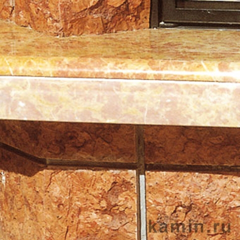 Угловая каминная облицовка из красного мрамора Asiago грубой обработки. Плита и фронтальный надтопочный архитрав из желтого мрамора Reale (сочетание полированного и полуполированного). Деревянная балка.